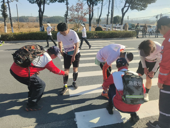 赛事当天,救援队成员身着统一的红十字队服,携带急救物资和通讯设备,凌晨5点便已抵达现场,配合公安等部门首先完成赛道安全检查。随着8点鸣枪开跑,在赛道上,救援队员们以高度负责的敬业精神,饱满热情的工作状态,娴熟过硬的业务技能,守护着每一位参赛选手的健康和生命安全。队员们全心投入,沿赛道全程巡视,密切关注着参赛选手的身体状况,随时准备为需要帮助的人提供应急救护。面对有的跑者出现晕倒、肌肉扭伤、拉伤、擦伤、痉挛等突发状况,队员们用随身携带的急救包对其进行简单的外伤消毒与包扎、物理降温。“弯着腰、低着头”成为他们统一的标准动作。红十字救援队员们以良好的精神风貌、过硬的救护技术、贴心的人文关怀,圆满完成此次赛事应急救护保障任务。